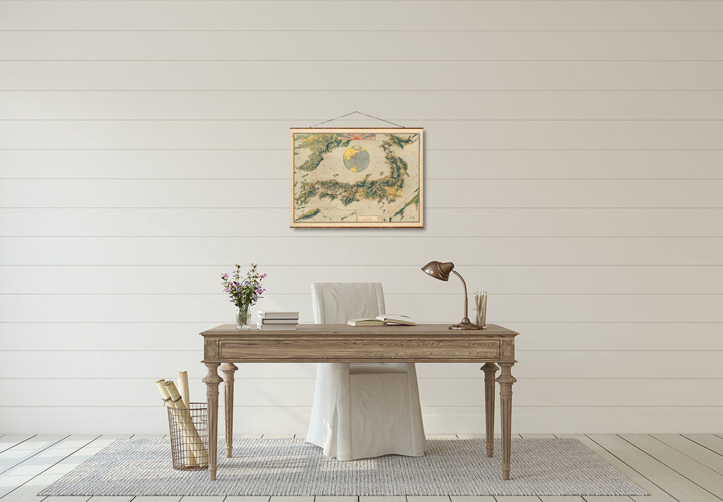 The 1915 Japan map is a vintage canvas map reproduction that captures Japan's territory in the early 20th century, including Korea and Taiwan. This restored antique Japan map offers history enthusiasts and collectors a detailed topographic vintage map printed on high-quality canvas scroll wall art, delivering an authentic glimpse into Japanese territorial boundaries from over a century ago. Measuring from 21 by 28 inches to 44 by 59 inches, this Japan Korea Taiwan map brings farmhouse rustic decor charm and large format wall art impact to any room.