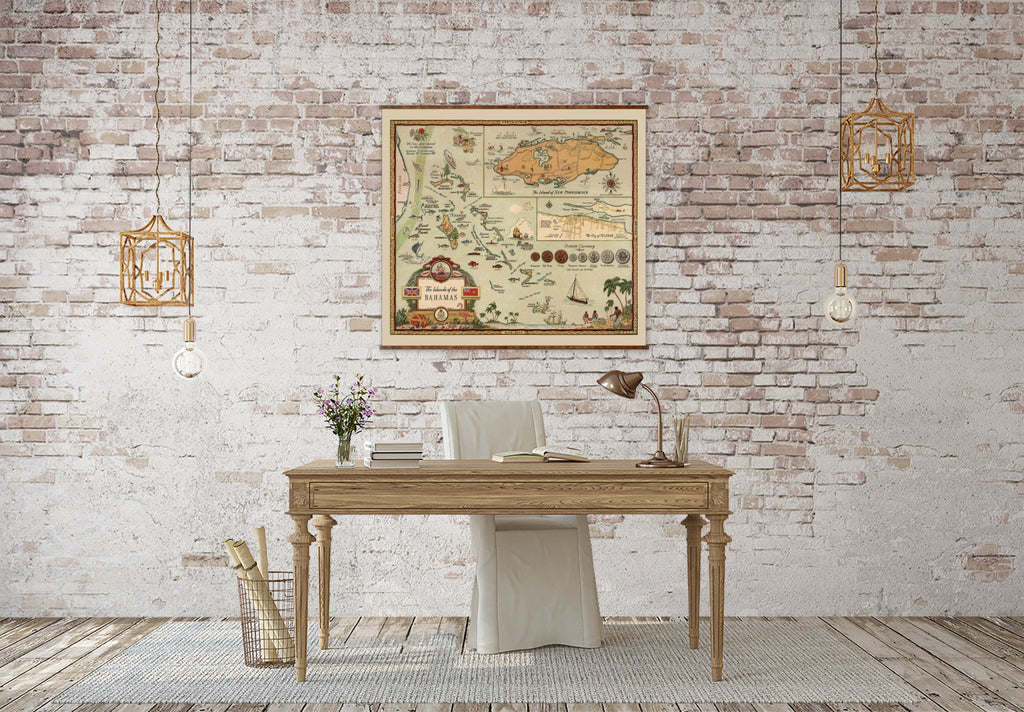 Ordering is simple—select your preferred size from the dropdown menu, and expect your map to ship within 3-5 days. Whether displayed in a living room, study, or hallway, this antique style map elevates your space while preserving the beauty of the Bahamas island map in a durable roll down canvas format.