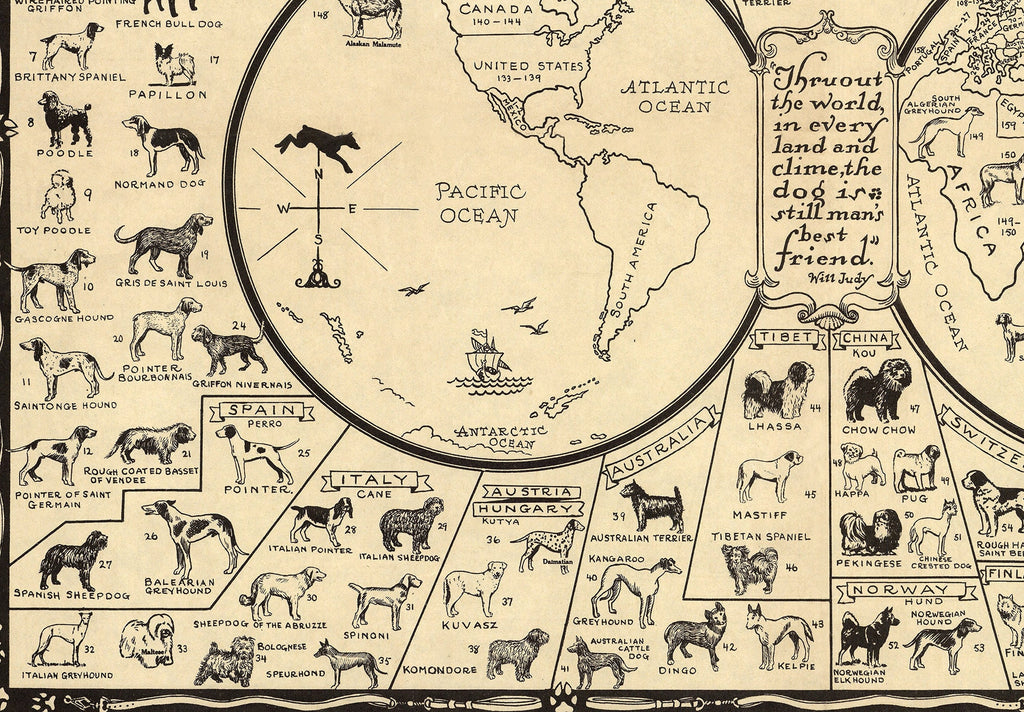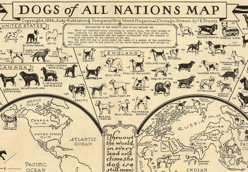 This dog breed map is a vintage dog map canvas wall art that beautifully displays the geographical distribution of 164 pure dog breeds around the world as of 1936. Designed to bring a rustic farmhouse decor touch to your home, this historical dog map offers dog lovers a unique and educational canvas wall art piece that combines antique charm with detailed artistry. Printed on heavyweight 23 mil Epson Exhibition Satin Canvas using a 12-color Canon Pro 4100 printer, this rolled canvas print captures every detail of the original antique dog map, restored carefully to preserve its vibrant colors and intricate illustrations.