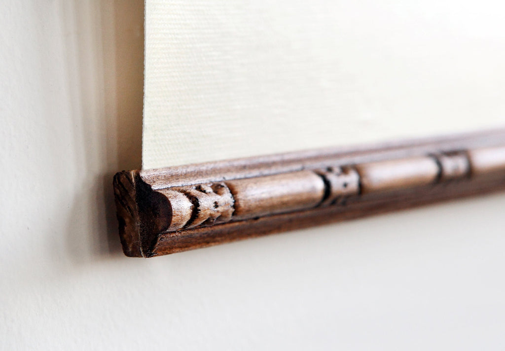 - Decorative stained wood top and bottom pieces with eye-hooks for easy hanging