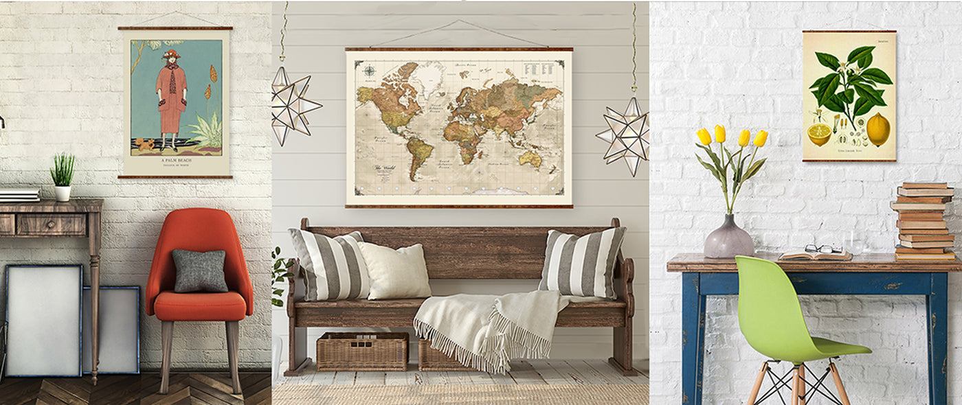 This is a current, up to date map of the World with our signature vintage look and printed on a high quality fabric paper that has a peel away backing. It can be applied directly to the wall or put onto a foam core or wood backing (not included) for framing. It is the perfect Push Pin Map to show all of your travels. We include a metal tin with 100 multi color pins.