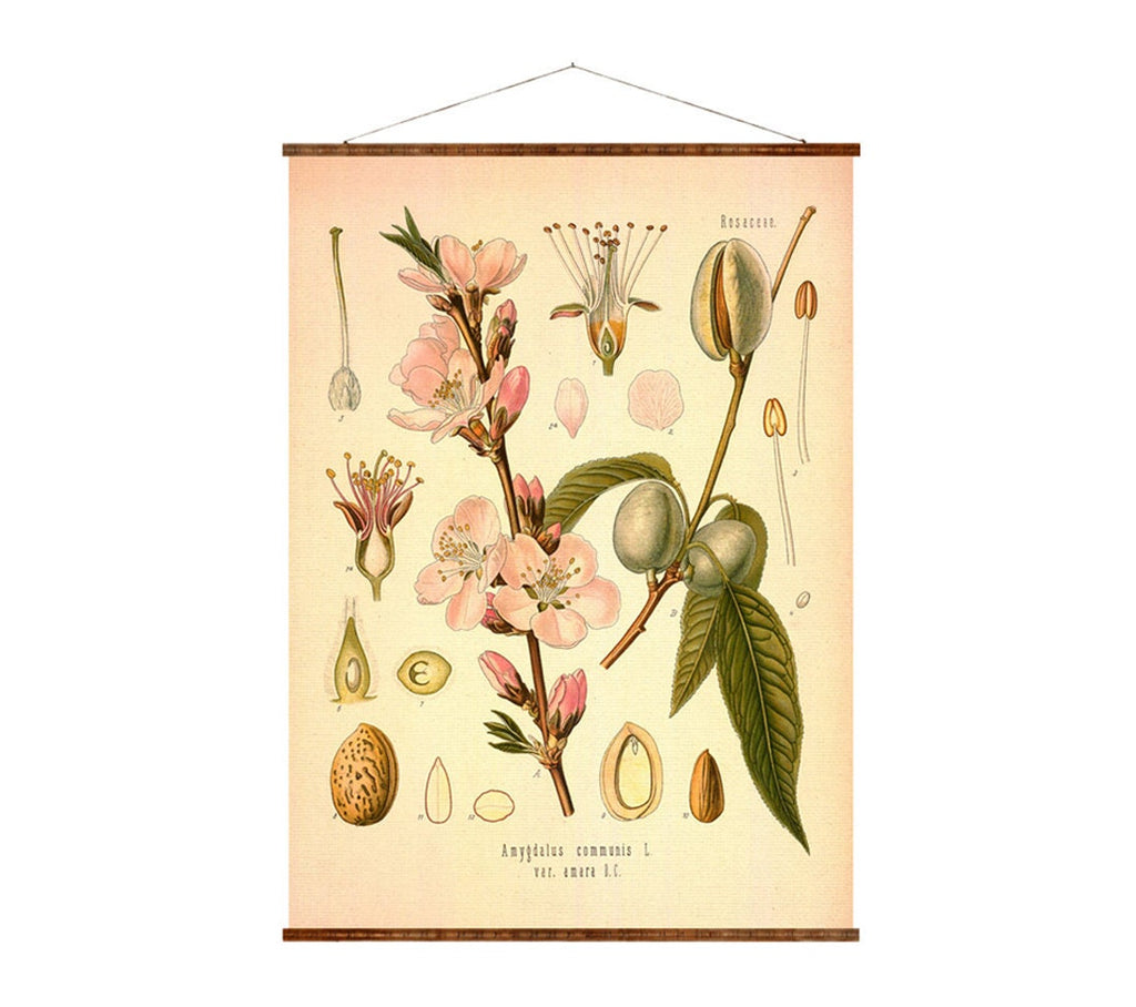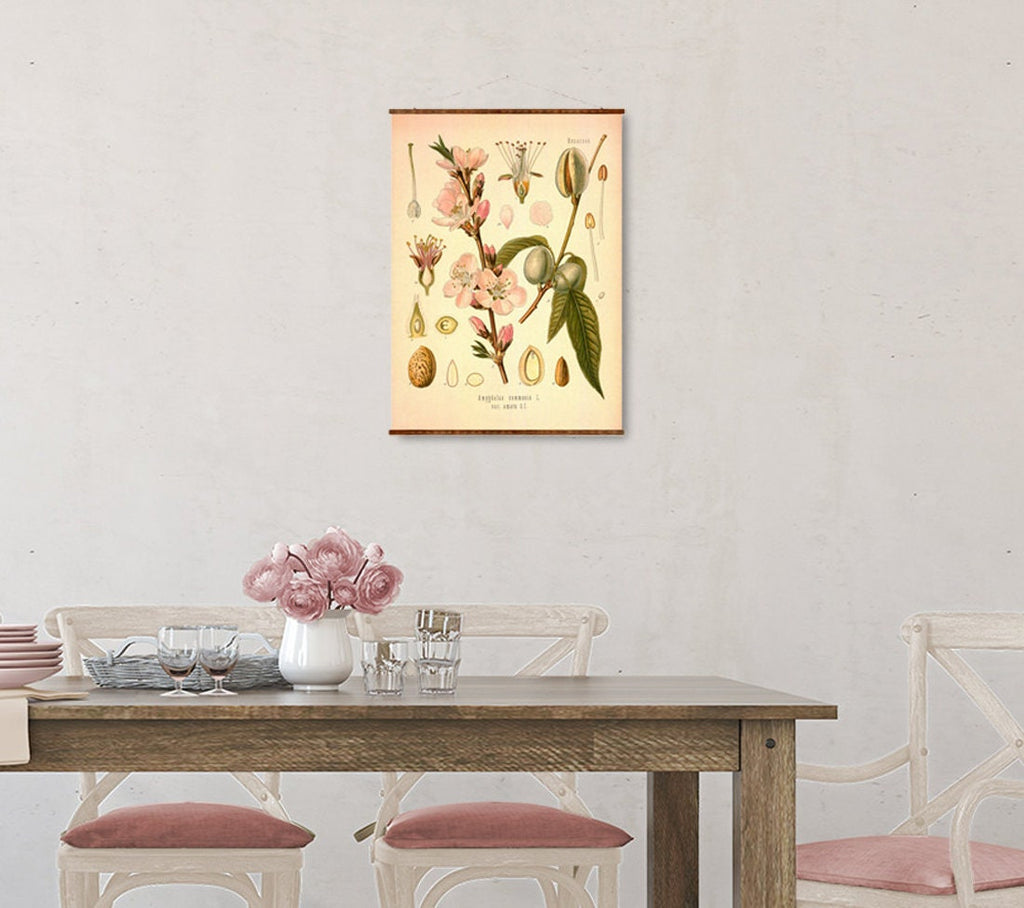 This Almond botanical art piece brings authentic medical plant illustration style into your home, perfect for collectors and lovers of vintage home decoration. The semi-gloss satin finish, protected by elastic polymers, provides durability and a lasting floral vintage canvas look that resists fading. Each canvas scroll features decorative wood trim on top and bottom, complemented by eye-hooks and natural jute rope twine for an easy ready to hang art experience. This shabby chic decor aesthetic makes it an ideal choice for kitchen wall art or any botanical wall decor setting.