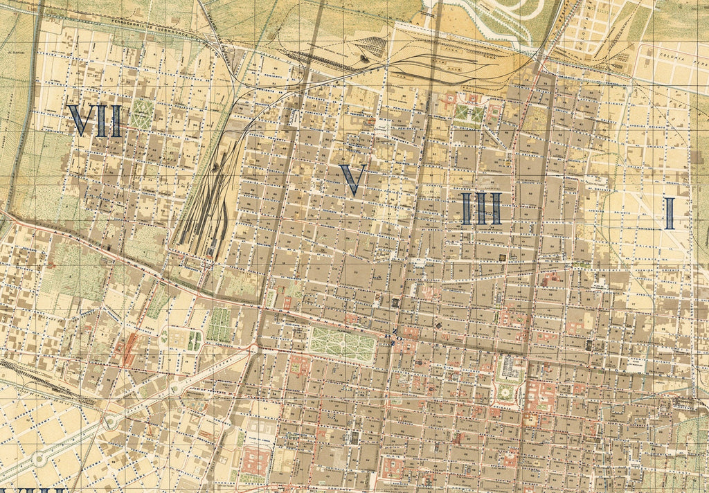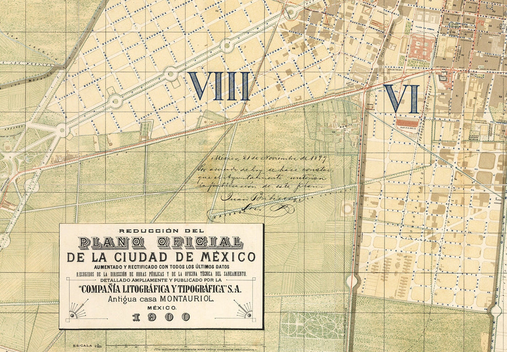 This Mexico City map 1900 is a detailed archival map print that captures the historic layout of the city with precision and vibrant color. Based on official measurements provided by the civic government, this vintage city map from 1900 offers a faithful reproduction of Mexico City's streets, landmarks, and neighborhoods as they appeared over a century ago. The map includes 194 significant sites such as major landmarks, Roman Catholic and Protestant churches, cathedrals, theaters, hotels, telegraph offices, markets, casinos, prisons, and colonial palaces marked in red with multiple courtyards. This detailed Mexico City map provides an authentic glimpse into the city's urban fabric at the turn of the 20th century.