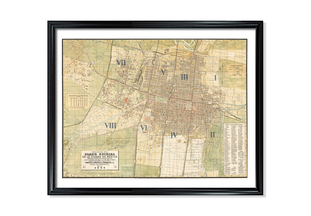 Our archival map print is carefully restored by hand to preserve the original craftsmanship. We repair faded colors and mend any damages to ensure every detail is clearly visible and true to the original old Mexico City plan. Printed in large format using a 12-color Canon Pro 4100 printer on heavyweight 280g Sunset Photo Matte Paper, this printed street map delivers rich color saturation and sharp detail. The piece includes a subtle 1/8 inch white border for easy framing.