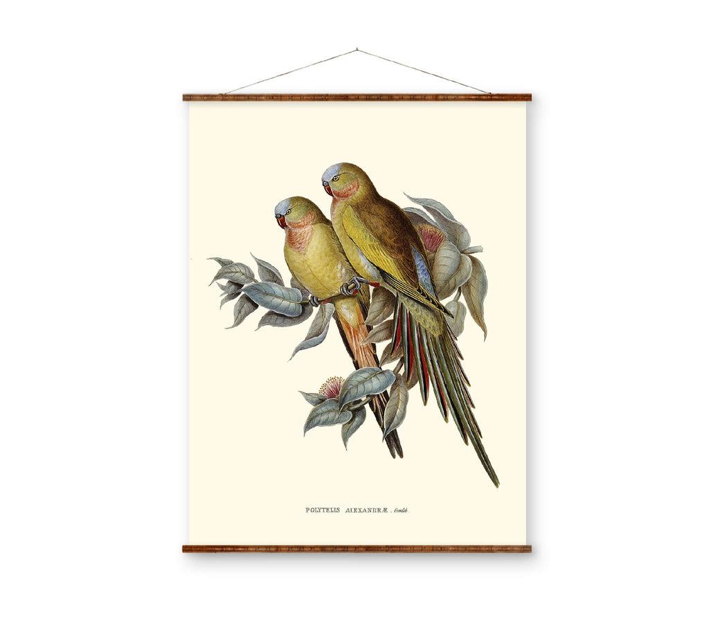 This parakeet bird illustration captures the exquisite beauty of the Princess of Wales's Parakeet, making it a stunning addition to your home decor. Our parakeet bird illustration is printed on heavyweight 23 mil Epson Exhibition Satin Canvas, ensuring vibrant colors and durability for long-lasting enjoyment. Perfect as vintage bird decor, this canvas bird print brings a touch of Australian wildlife into your living space while serving as a nature wall hanging that sparks conversation.