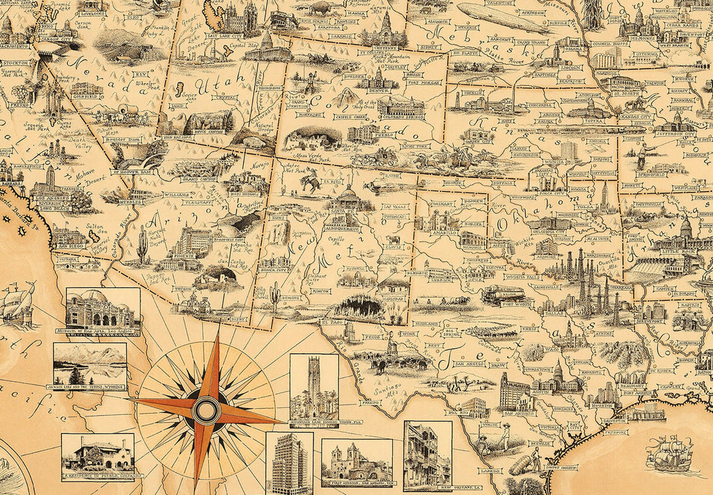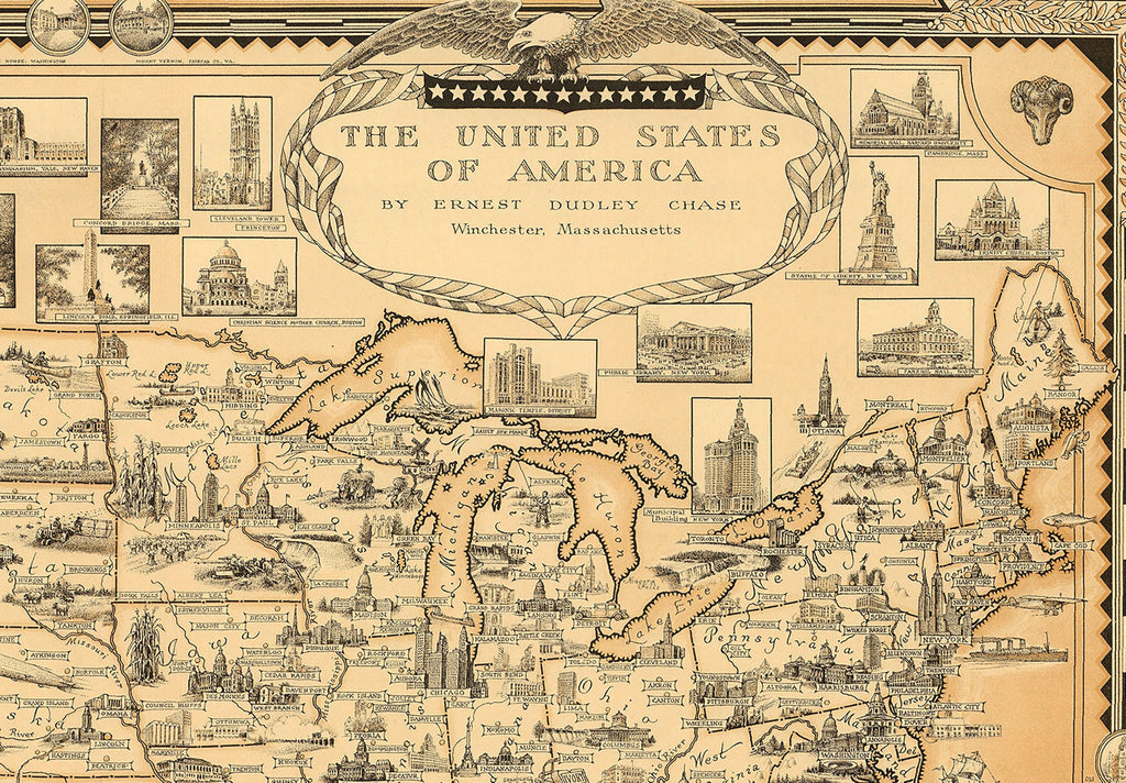 - Pictorial US map design → Combines geographical accuracy with artistic illustrations