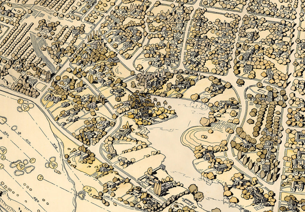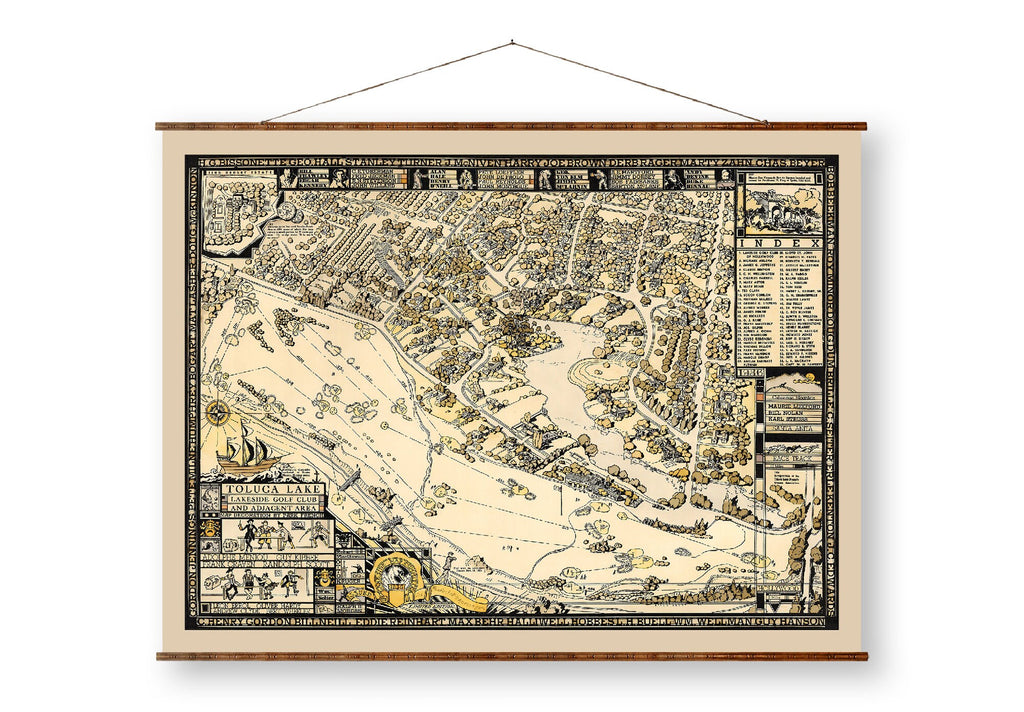 The Toluca Lake map canvas is a hand restored vintage canvas scroll that brings the charm of historical wall art to your home or office. This Toluca Lake map canvas features a detailed depiction of the lakeside golf map and surrounding golf club area, making it an exceptional decorative wall map for enthusiasts of antique style maps and Los Angeles map art. Printed on heavyweight 23 mil Epson Exhibition Satin Canvas using a 12-color Canon Pro 4100 large format printer, this large canvas scroll offers vibrant colors and lasting durability. Each piece is carefully hand restored to repair faded colors and mend damages, ensuring you receive a revitalized historical treasure that preserves every intricate detail.