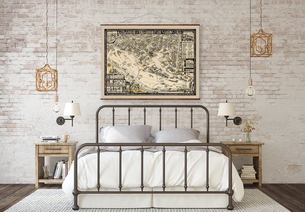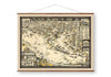 This vintage canvas map is enhanced with protective elastic polymers for added longevity. Decorative wood stained and varnished adorns the top and bottom edges, with two eye-hooks mounted on the top piece for easy hanging. A jute rope twine is included to complete the authentic roll down canvas scroll look.