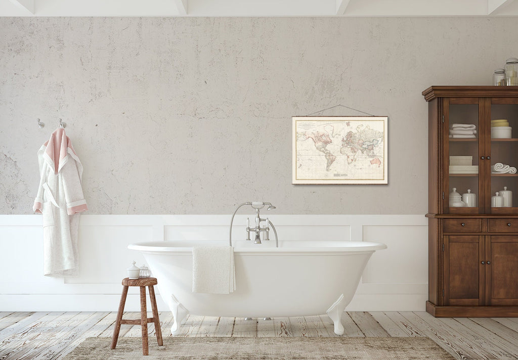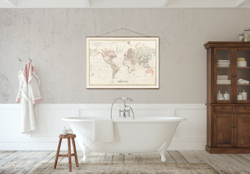 The 1808 world map is a vintage world map reproduction that brings the charm of 18th century cartography into your home. This antique canvas map captures the latest discoveries and voyages of renowned navigators like Columbus, Cook, Bougainville, and Tasman. Carefully hand restored, this canvas scroll map offers a historical world map experience that enhances any space with authentic nautical explorer chart details. Printed using a large format map print process in our Los Angeles studio, this decorative wall map combines craftsmanship with durability for a ready to hang map that fits rustic farmhouse decor or classic interiors.