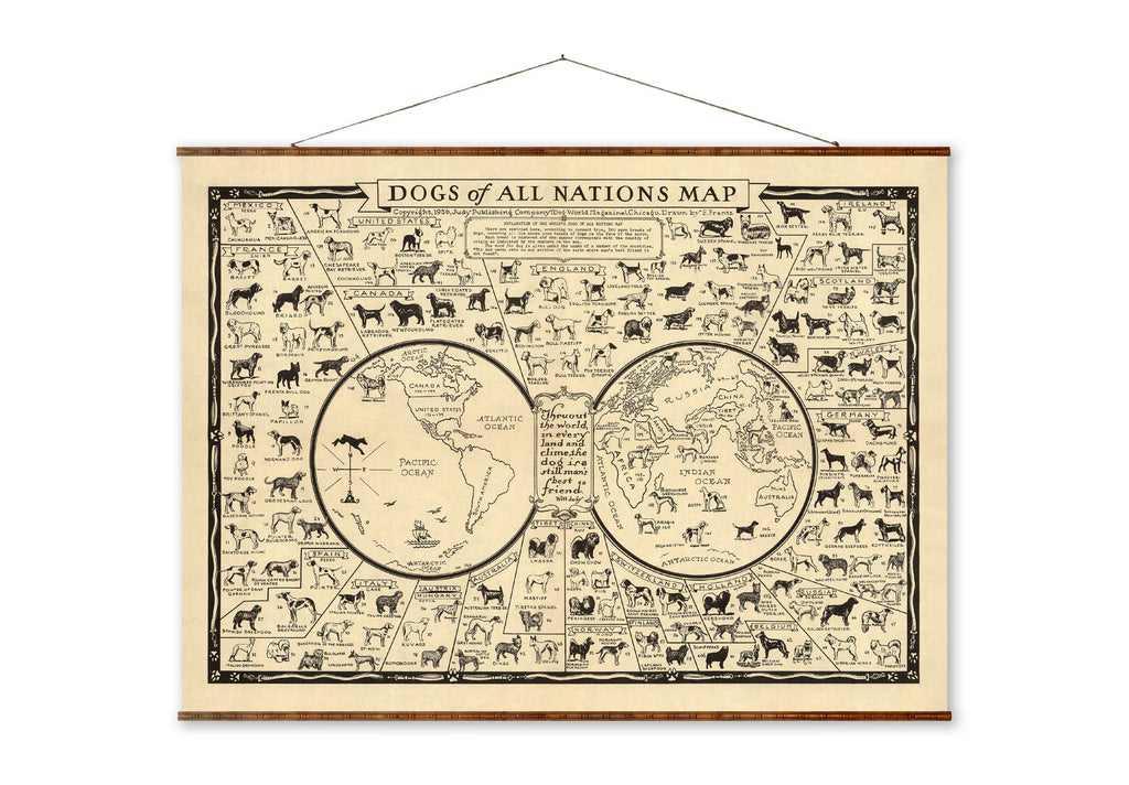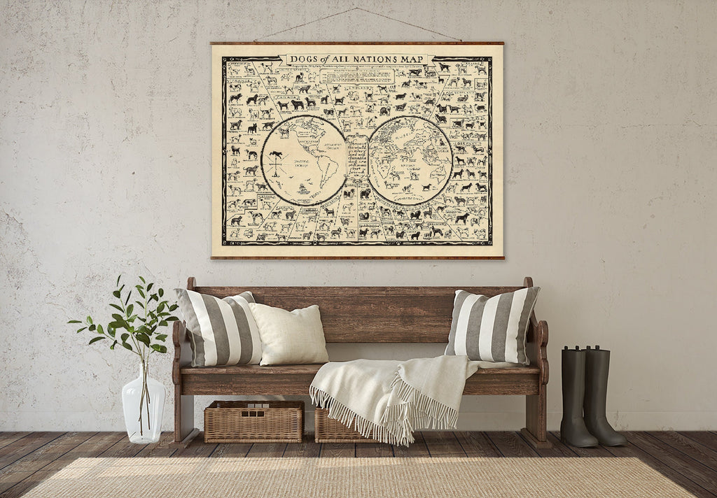 This dog breed map is a vintage dog map canvas wall art that beautifully displays the geographical distribution of 164 pure dog breeds around the world as of 1936. Designed to bring a rustic farmhouse decor touch to your home, this historical dog map offers dog lovers a unique and educational canvas wall art piece that combines antique charm with detailed artistry. Printed on heavyweight 23 mil Epson Exhibition Satin Canvas using a 12-color Canon Pro 4100 printer, this rolled canvas print captures every detail of the original antique dog map, restored carefully to preserve its vibrant colors and intricate illustrations.