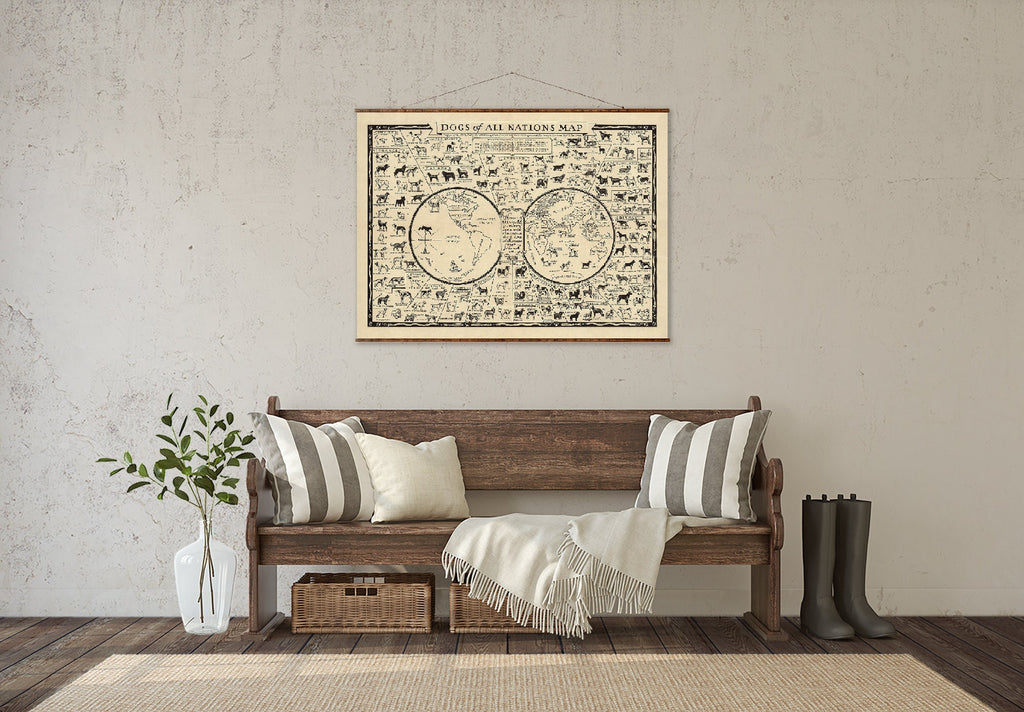 Each animal breed map features miniature portraits grouped by nation, showing the exact locations of world dog breeds with numbered labels for easy identification. This decorative canvas scroll comes with stained and varnished wood pieces on top and bottom, complete with eye-hooks and a jute rope twine for authentic hanging and rustic farmhouse decor appeal. Available in three sizes—small (21 x 28 inches), medium (33 x 44 inches), and large (44 x 60 inches)—this dog breed chart fits perfectly in any room or office space.