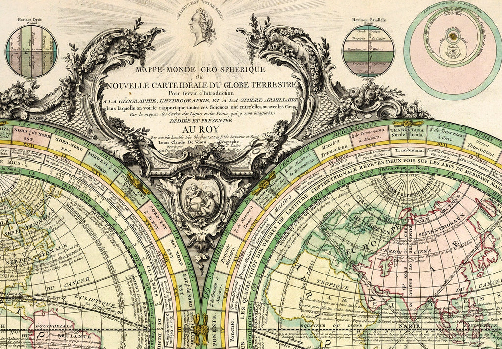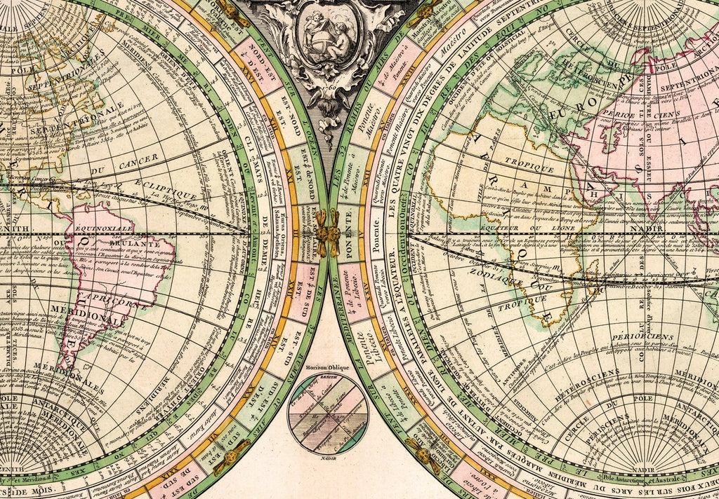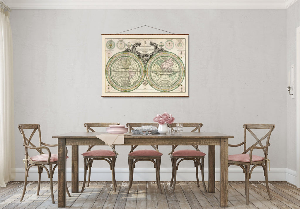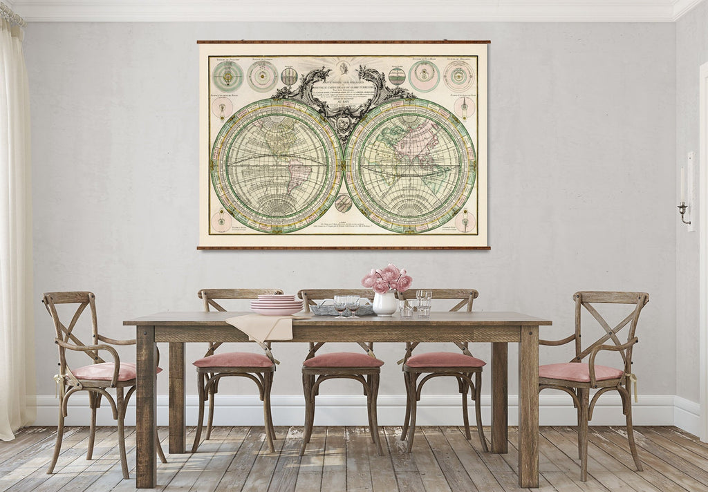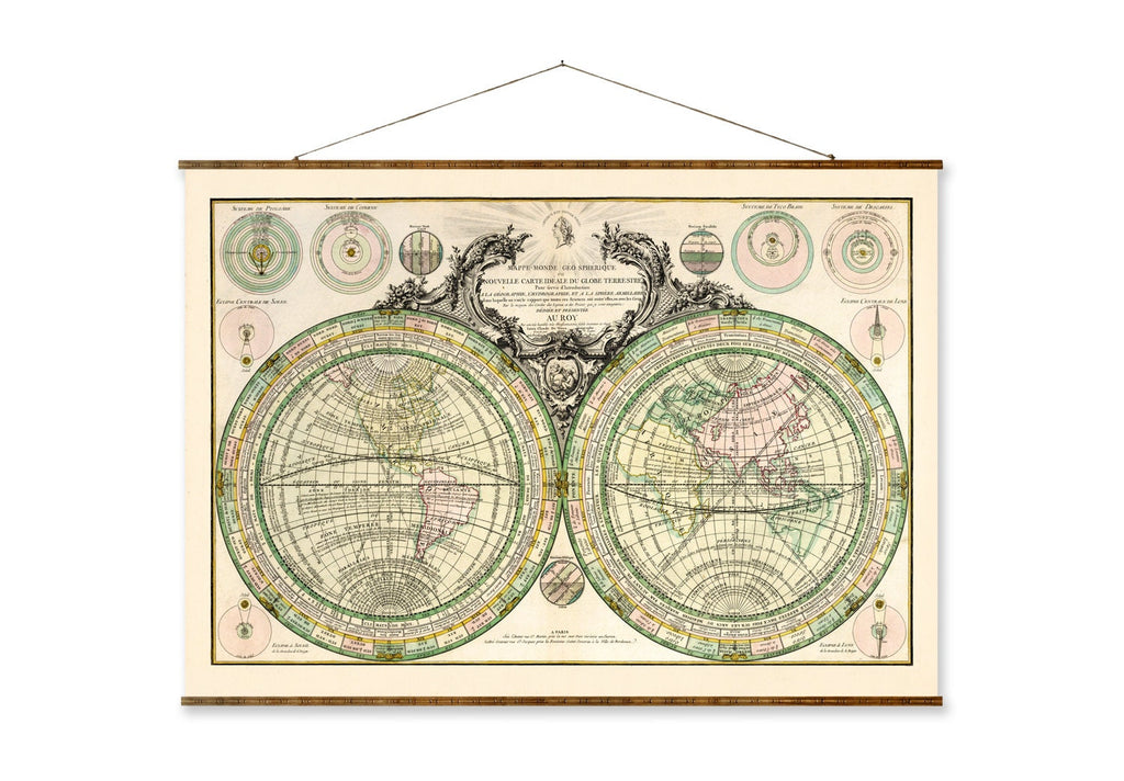 The 1760 geo-spherique map is a stunning vintage world map reproduction that brings 18th-century cartography into your home with historical accuracy and artistic detail. This hand-colored map print features the classic armillary sphere diagram, solar eclipse chart, and climate zones map, providing a rich visual experience of the old world canvas. Crafted to offer both educational value and vintage home decor appeal, it serves as a centerpiece that transforms any room with its antique map print charm.