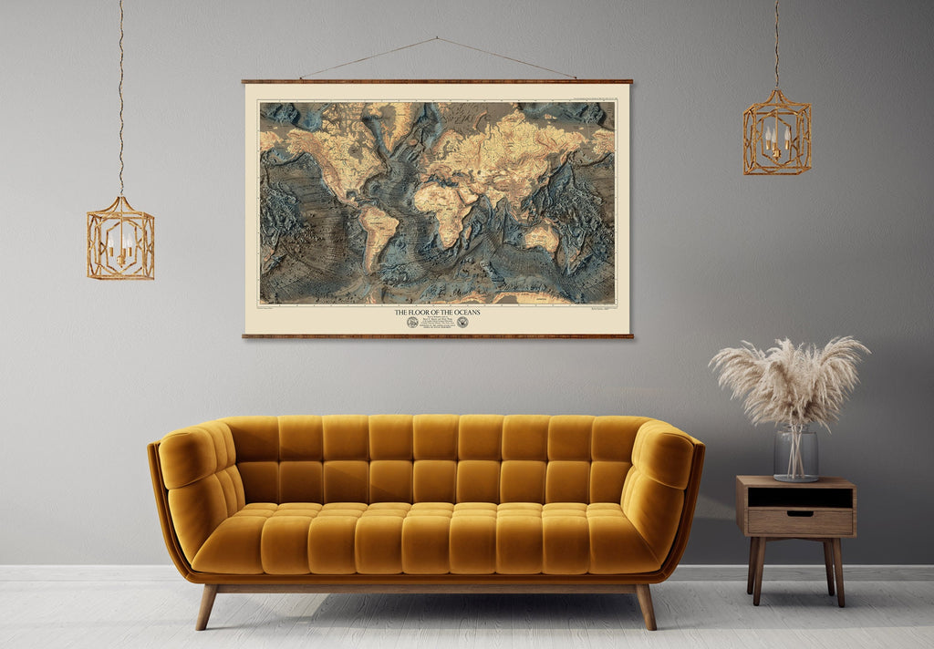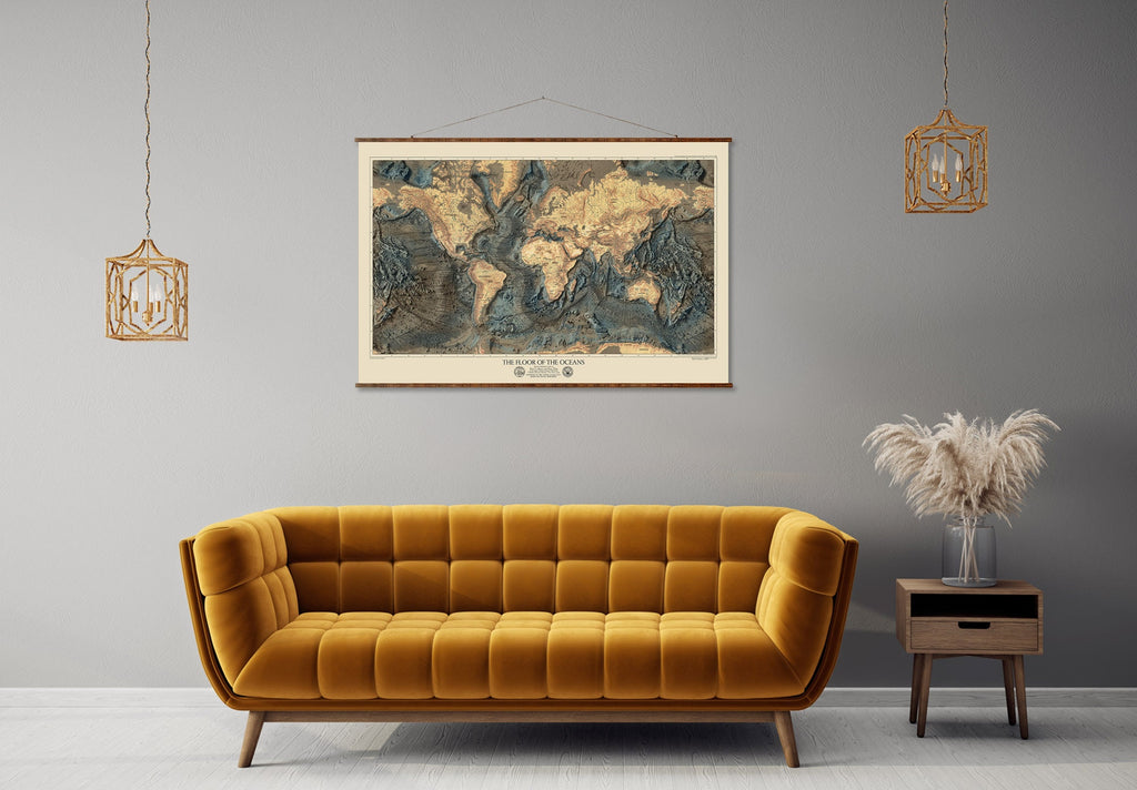 The world map canvas scroll is a vintage style map designed to showcase the ocean floor map and land relief map with stunning detail and historical accuracy. This canvas wall art captures the topography of the earth’s surface and ocean floors, offering a unique combination of geographical wall decor and vintage style map aesthetics that transform any room into a gallery of exploration and discovery. Crafted by Maps Vintage, this rolled canvas map brings together art and education in a decorative map scroll that appeals to both history lovers and home decor enthusiasts.