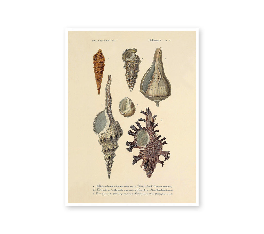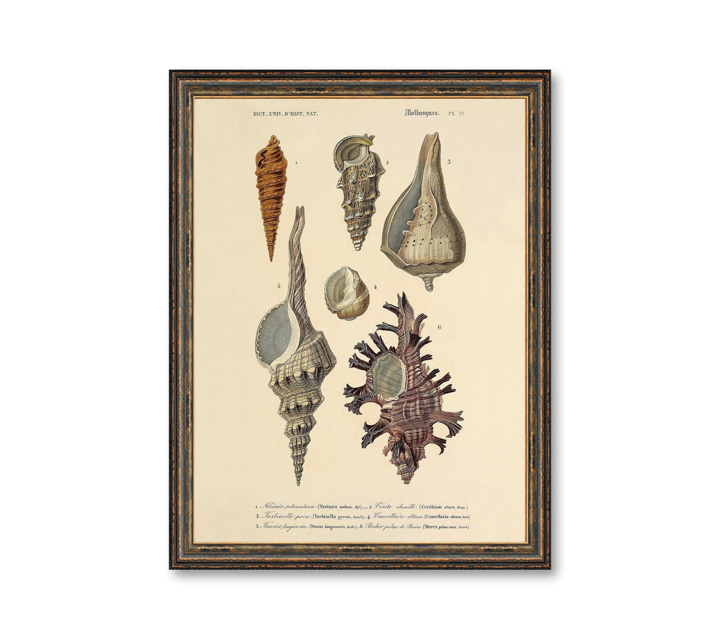 Our vintage wall art is produced in a downtown Los Angeles studio using a 12-color Canon Pro 4100 large format printer on heavyweight Sunset Photo Matte Paper. This archival paper print guarantees vibrant colors and long-lasting quality. The shells illustrations plate combines shabby chic decorations with classic sophistication, making it an ideal choice for beach art prints enthusiasts and collectors of historical reproductions alike.